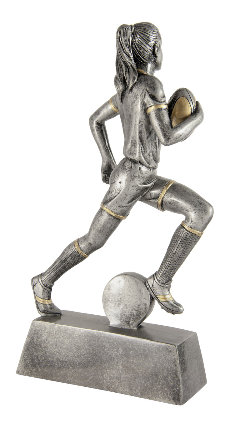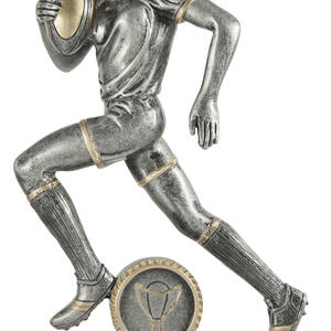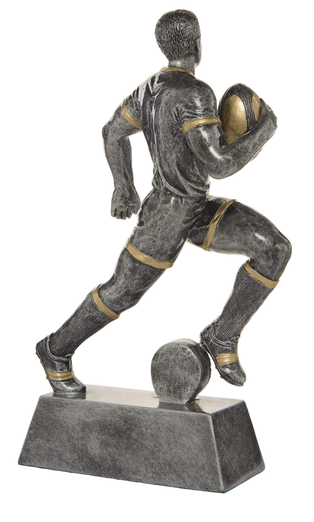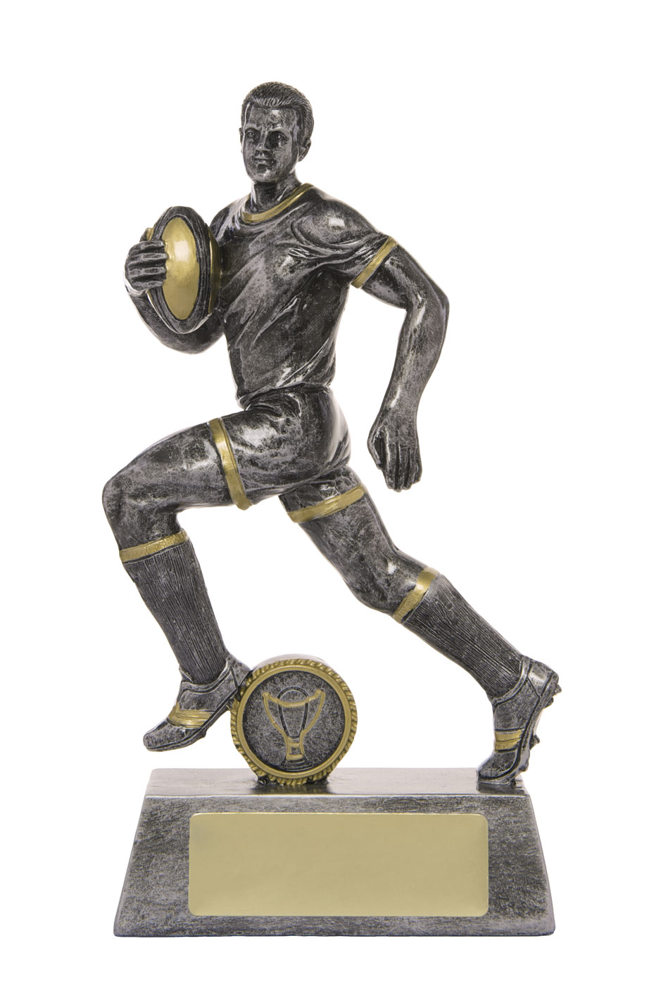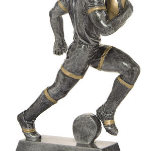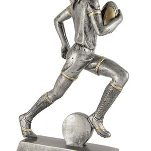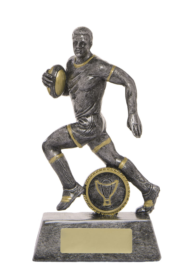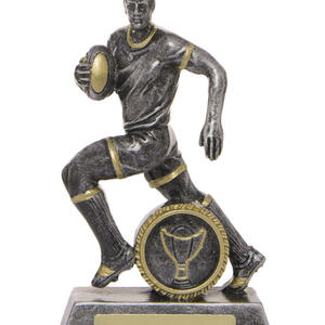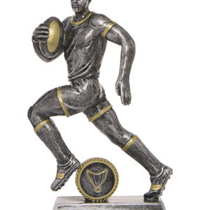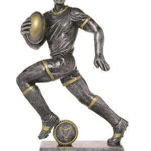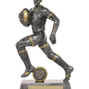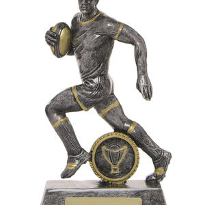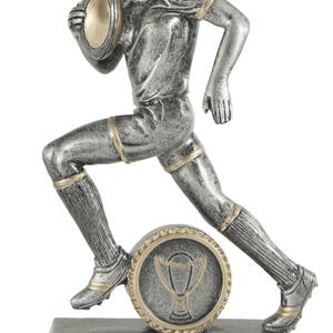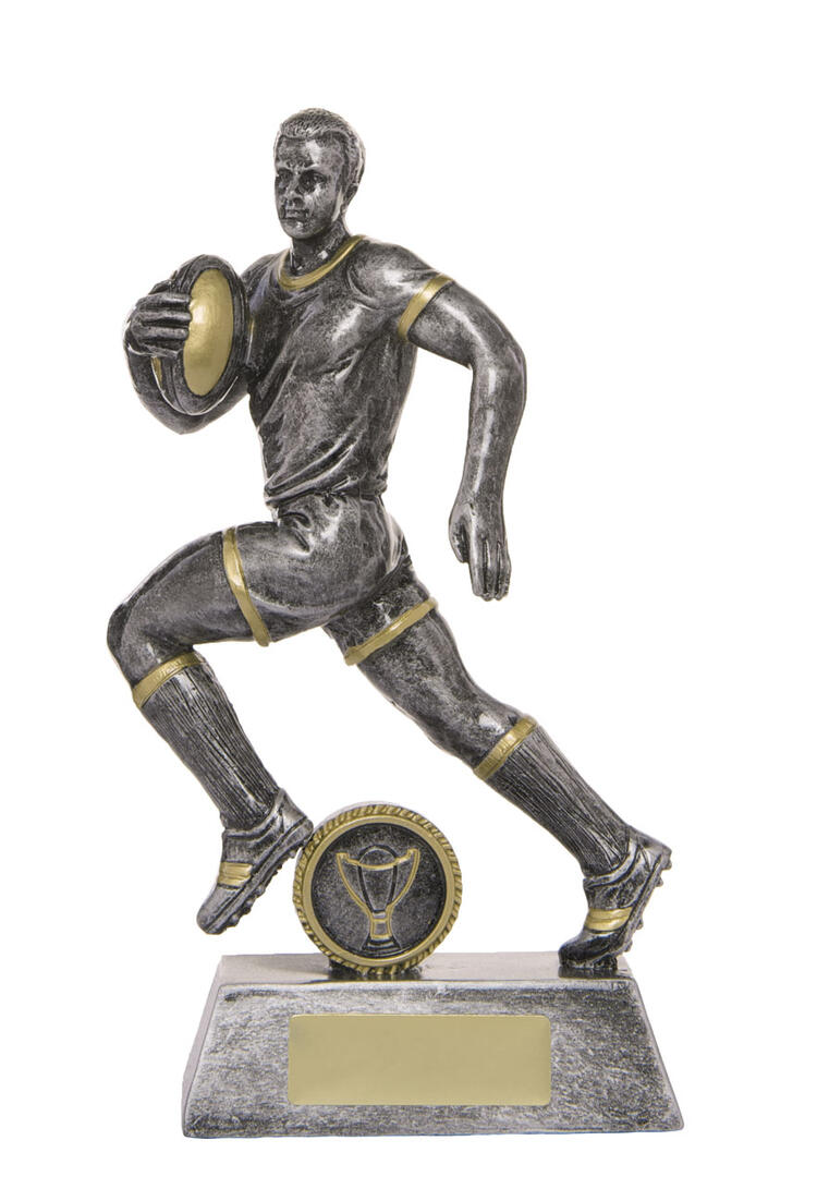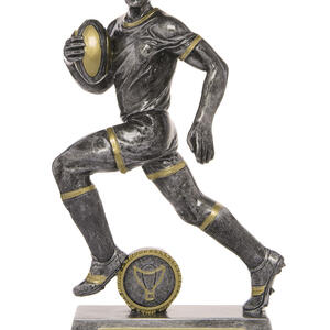 This rugby trophy captures the power and determination of the game with a dynamic male player figurine in motion. Crafted from resin, it features a refined grey finish with gold accents, mounted on a sturdy rectangular base with a circular emblem.