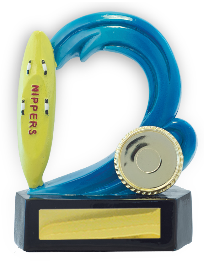 Celebrate achievement in surf lifesaving with this elegant wave shaped trophy, designed in striking blue, yellow, black, and gold tones. Featuring a dynamic blue wave and a yellow surfboard, the award's form reflects the spirit of the surf and the dedication of young lifesavers.