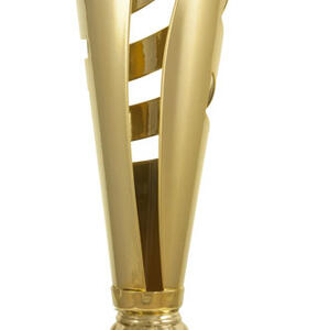 This gold trophy cup features a modern, abstract silhouette crafted from metal and set upon a black base. With its elegant lines and contemporary styling, it offers a sophisticated option for recognising achievement across corporate or sports settings. The Curva Cup Gold celebrates success with a design that is both striking and memorable.