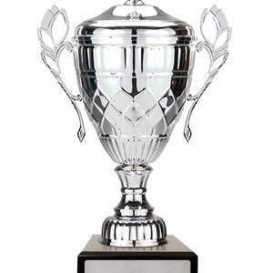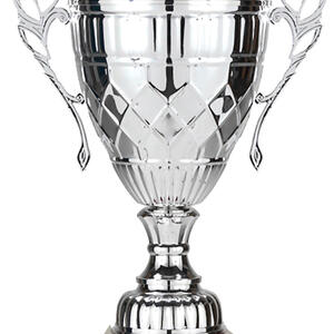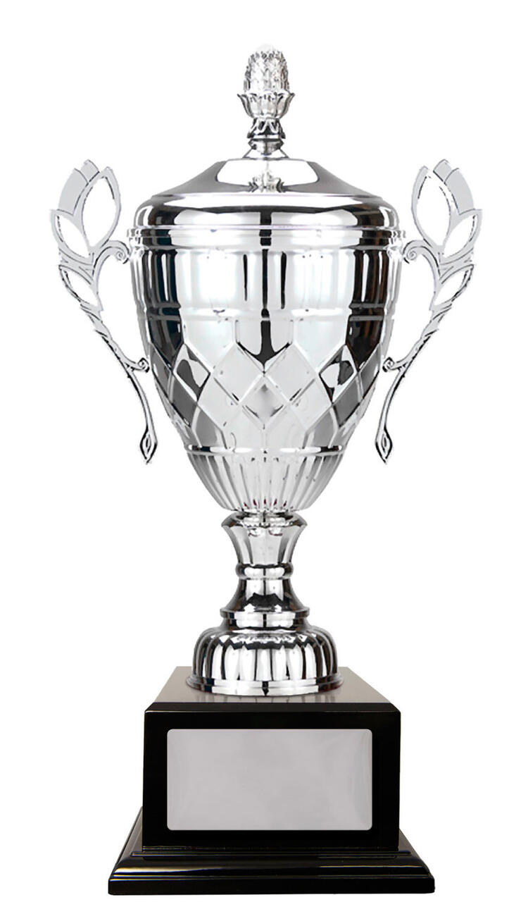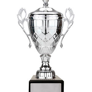 A classic winners cup, the Whopper Cup Silver combines elegant silver metal with a sturdy black base for a distinguished presentation. Featuring a refined cup design, complete with handles and a decorative lid, this silver cup trophy is suited for a wide range of sporting and achievement celebrations.