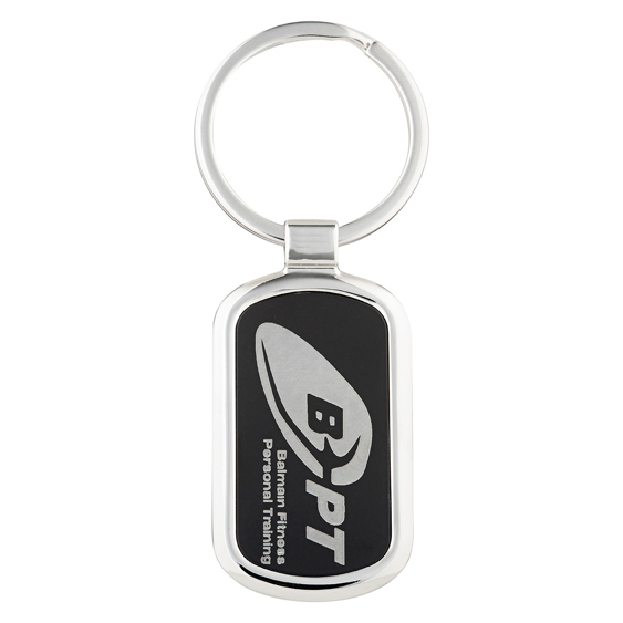 This rectangular polished metal key ring features a sleek black inlay panel, precision engraved for a professional finish. A smart and durable design ideal for promotional campaigns or keepsake gifts.