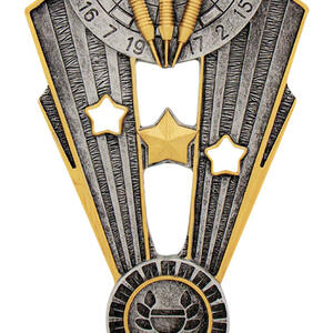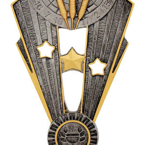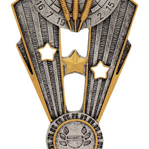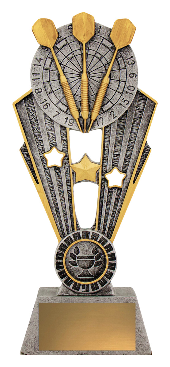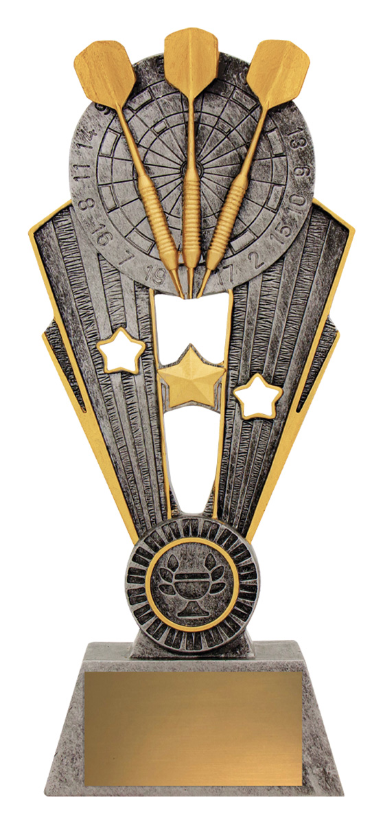 This contemporary darts trophy captures the excitement of competition with a detailed dartboard and three darts set against vibrant gold and silver tones. Crafted from quality resin, it features dynamic star motifs that bring a sense of achievement to any presentation, making it a distinguished choice for recognising excellence in darts.