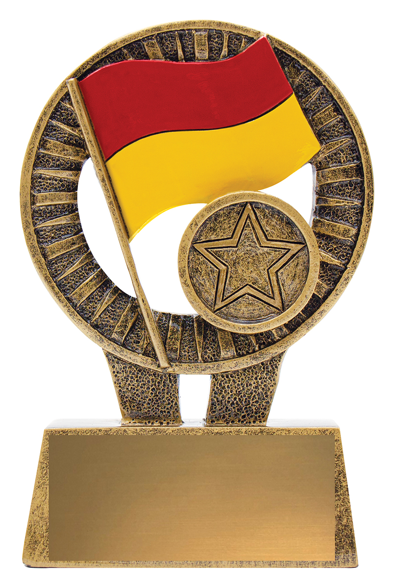 Celebrate achievement in lifesaving and community service with this striking trophy, crafted to symbolise dedication and teamwork. Showcasing gold, red, and yellow tones, it features a circular frame, flag motif, and a prominent star emblem. The durable metallic construction and customisable plaque create a distinguished option in surf lifesaving trophies for lasting recognition.