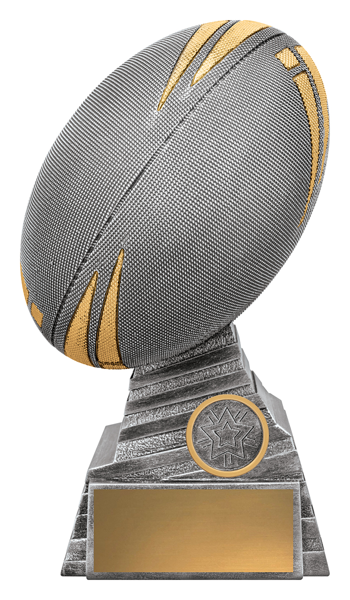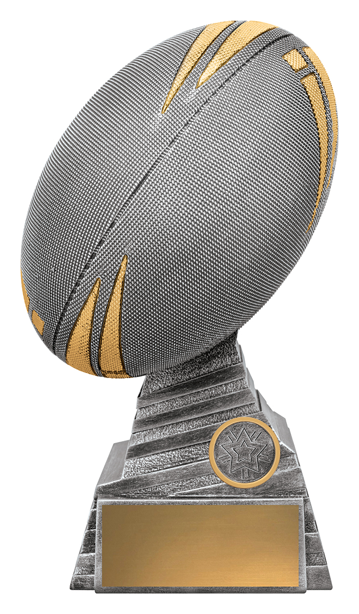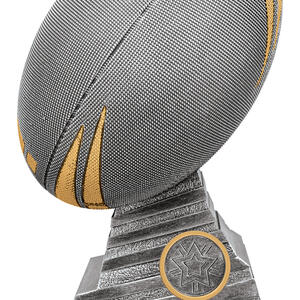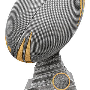 Crafted for lasting recognition, this rugby league trophy features a distinctive rugby ball design with a textured silver surface and striking gold accents. Resting elegantly on a sturdy pedestal, crafted from resin for both durability and style. The classic form makes it a memorable choice for celebrating achievement in rugby competitions.