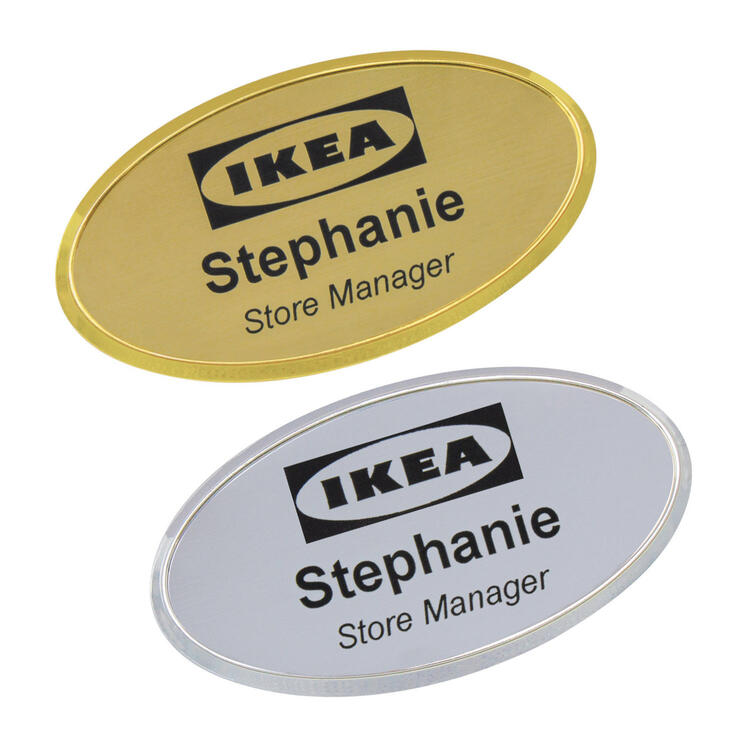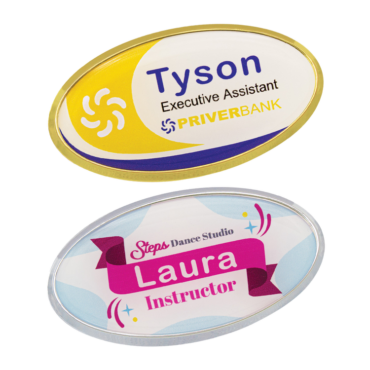 This Prestige Oval Name Badge features a gold, silver, or black frame with a full-colour printed insert that can display your logo, name, and title with professional clarity. The oval shape adds a touch of class to your team.