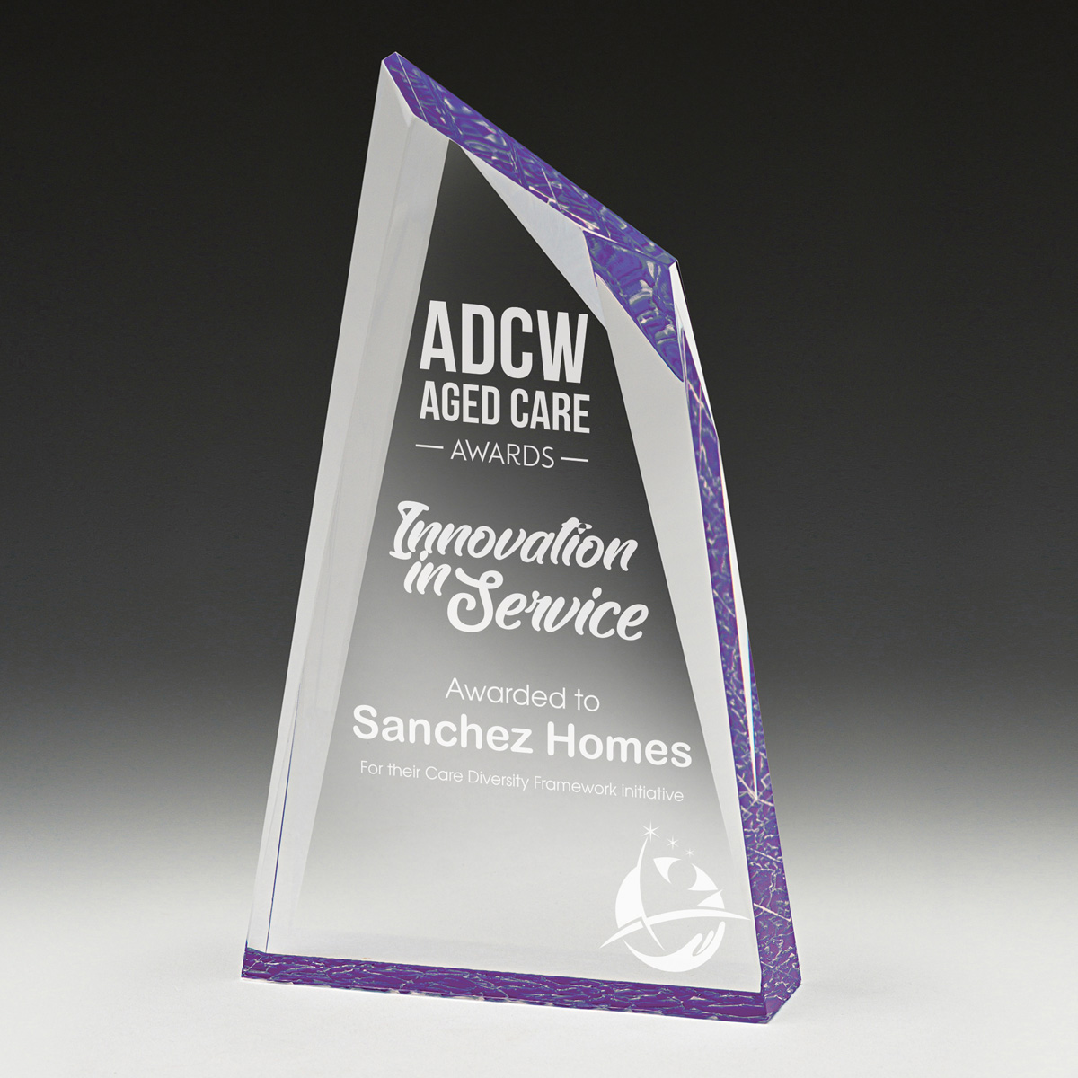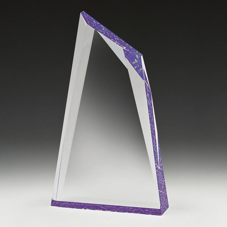 This contemporary award showcases an asymmetrical triangular prism form, highlighted by vivid purple accents along its edges and a sleek, clear body. Crafted from durable acrylic, it delivers a refined presentation with a modern touch. Ideal for recognising exceptional achievement, this piece offers a memorable and professional way to celebrate success in any setting.