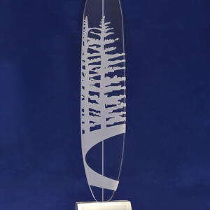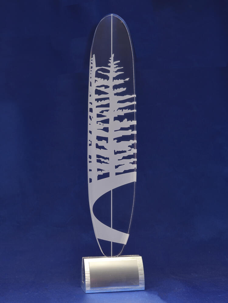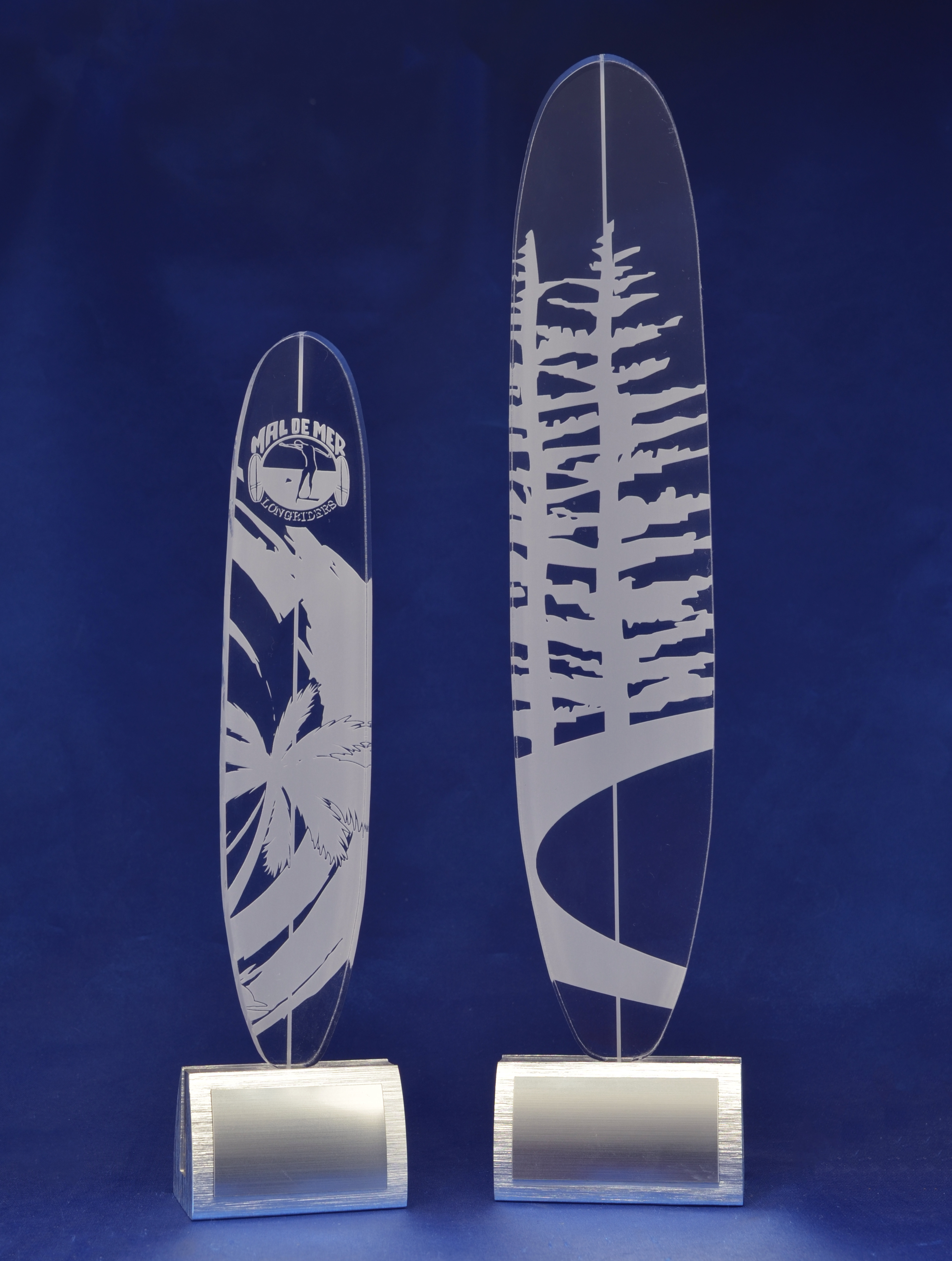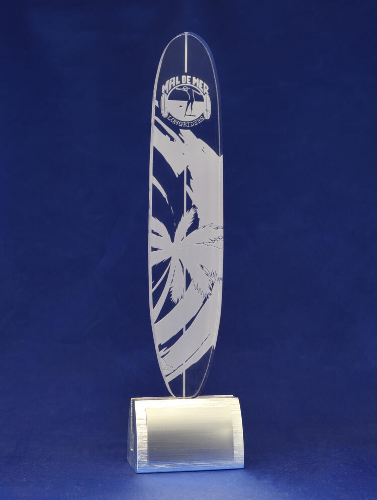 These acrylic longboard trophies combine clean surfboard shapes with detailed wave and palm etching for a modern surf vibe. Mounted on a brushed metal base, theyre available in multiple sizes. Perfect for surf clubs and beach competitions.