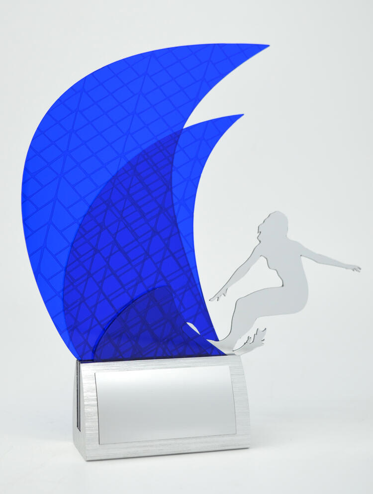 A vibrant blue wave acrylic trophy capturing the thrill of surfing. Featuring a metallic surfer silhouette and dynamic wave design, this award celebrates surf achievements with style and energy. Mounted on a brushed metal base for a premium finish.