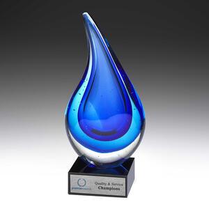 Art Glass Trophy - Vase Blue/Green On Black Base - With Printed Plate