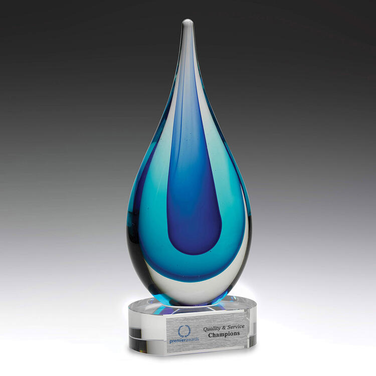 Inspired by the beauty of ocean waves, this glass award features a fluid teardrop shape in striking blue and clear tones. The expertly crafted glass highlights both precision and artistry, making it an elegant choice for recognising significant achievements. Its modern design ensures a memorable and professional presentation suitable for any formal celebration.