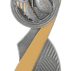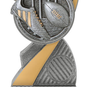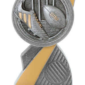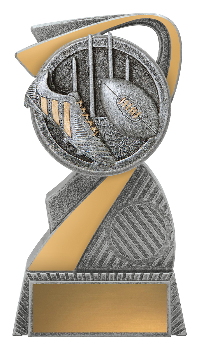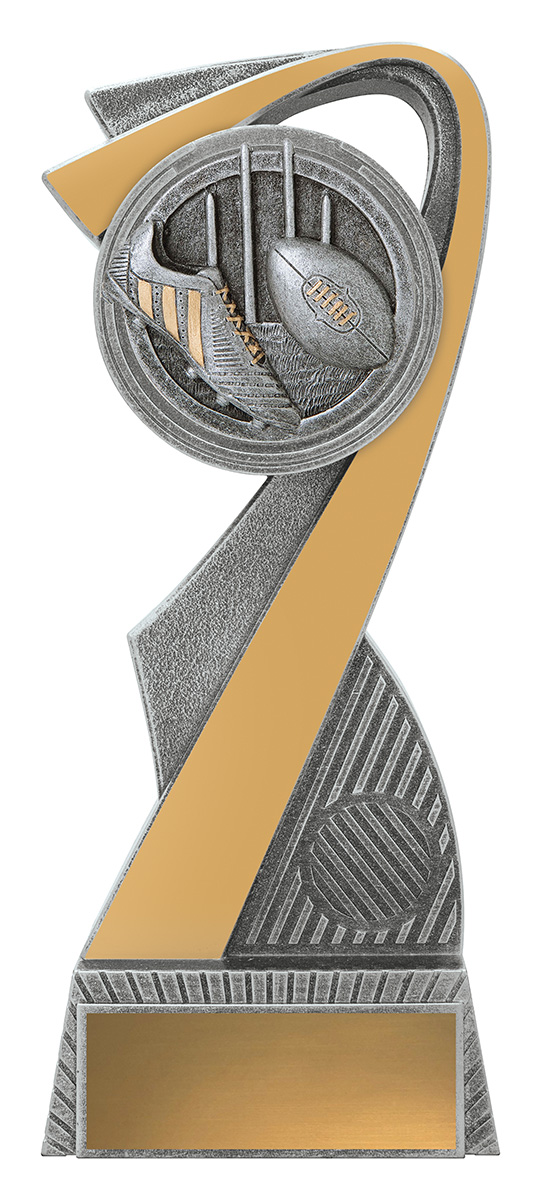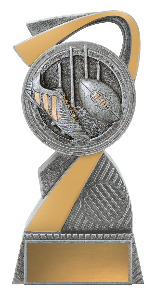 This aussie rules trophy features a striking abstract curved design, complemented by a circular top and finished in refined silver and gold tones. Crafted from quality resin, its detailed football, boot, and goal posts elements capture the spirit of Australian football.