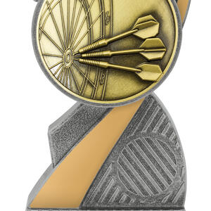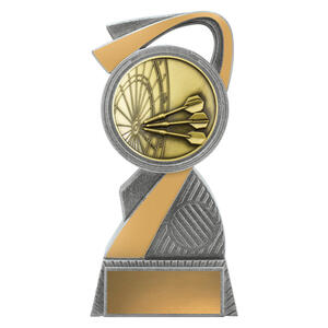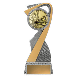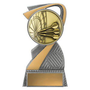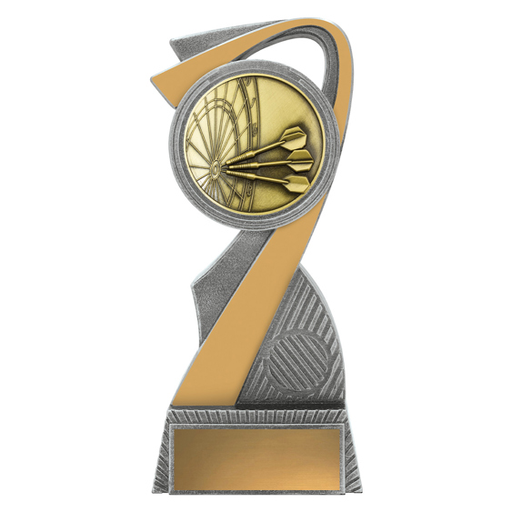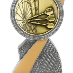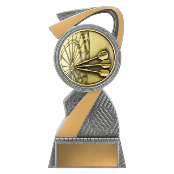 This antique gold resin darts trophy displays a dartboard design with three darts in flight. Crafted in solid resin with detailed texture and finished in gold tones, itÂ’s an excellent choice for darts champions.