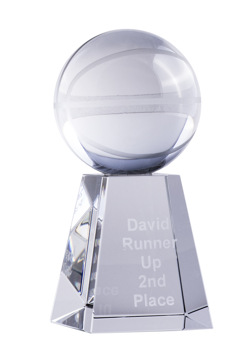 This elegant basketball trophy is crafted from premium crystal, featuring a clear spherical top with a classic basketball design. A 3D laser image of a basketball player is embedded within the tapered pillar, highlighting the artistry and significance of the sport. The sturdy base offers personalised engraving.