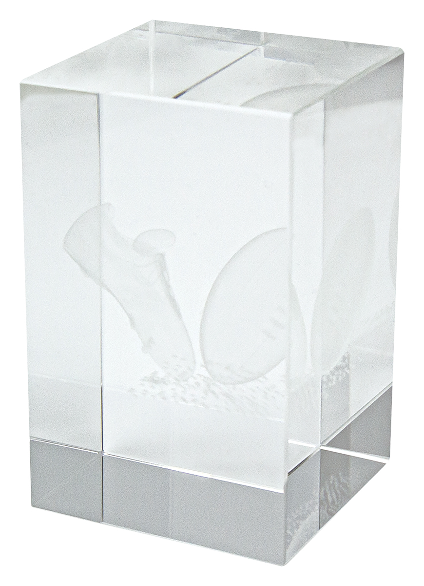 The Rugby Crystal Block is a refined rubgy trophy crafted from clear crystal in a sleek rectangular prism. Inside, an intricate 3D design of a rugby ball and boot is suspended, capturing the spirit of the game with precision and artistry. Its elegant form and durable construction make it a memorable recognition piece for rugby achievements.