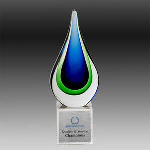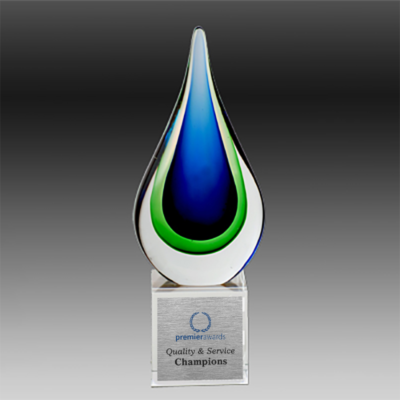 This glass award trophy is a striking fusion of artistry and craftsmanship, expertly hand-blown to create a unique teardrop form. Blue and green gradients flow through the hollow glass, interspersed with multicoloured accents, all mounted on a polished clear base. I