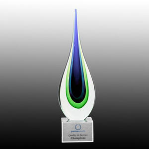 Art Glass Trophy - Vase Blue/Green On Black Base - With Printed Plate