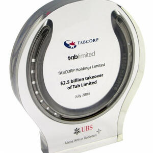 An evolution of the classic embedment style. Add a three-dimensional themed object within the acrylic to create a dynamic focal point. Supply your own item, or have us design and produce it for you —a neat, sophisticated way to commemorate a momentous transaction. Almost anything can be embedded into acrylic resin financial tombstones.