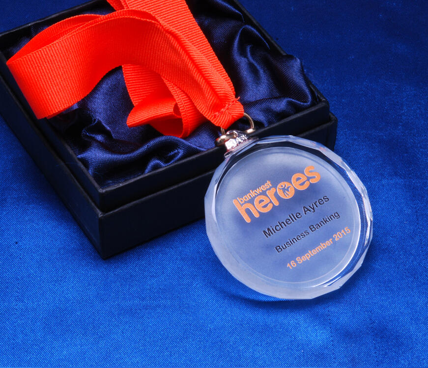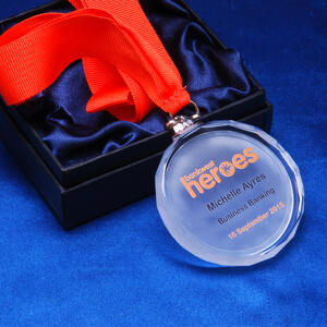 The medallion features a full colour digital print of your logo, crest, or message for a personalised touch. Supplied with a ribbon and presentation box, this crystal medallion delivers lasting recognition with elegance and style.