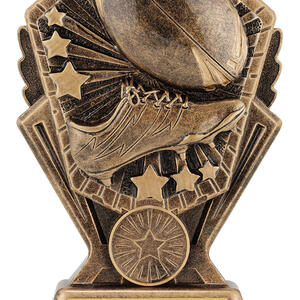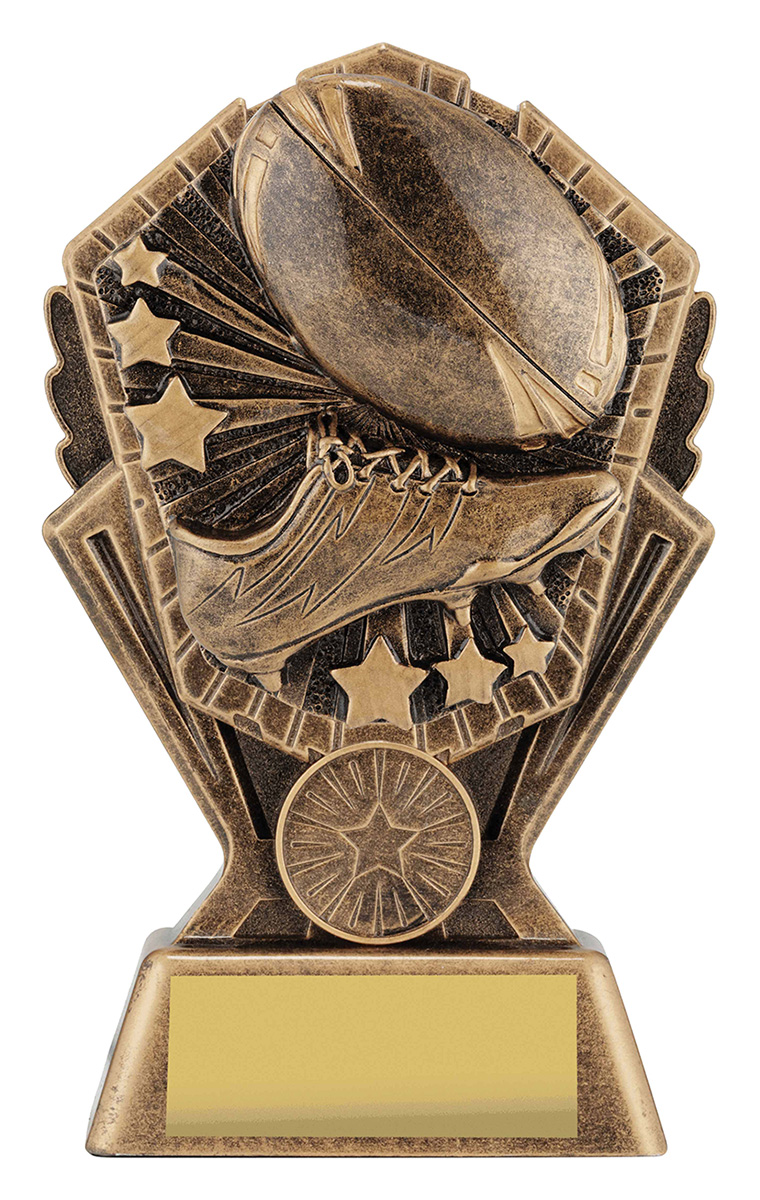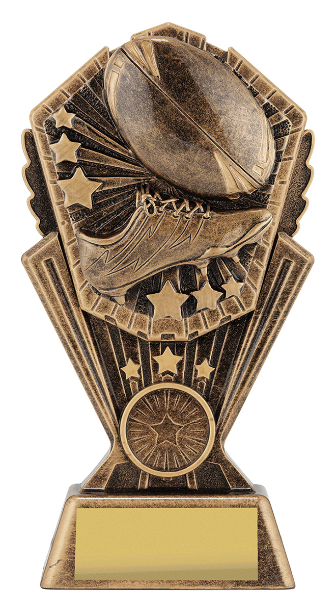 Crafted in elegant gold tones, this rugby league trophy features a striking football and cleat design accented by star decorations. The durable resin construction offers a professional finish, making this award a memorable choice for recognising achievement in rugby. Celebrate dedication and teamwork with a trophy that captures the spirit of the game.