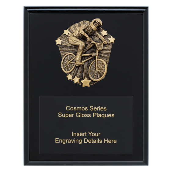 Antique gold BMX trophy with modern angled frame and textured detailing. Features a raised BMX rider emblem, symbolising motion and power. Perfect for performance awards.