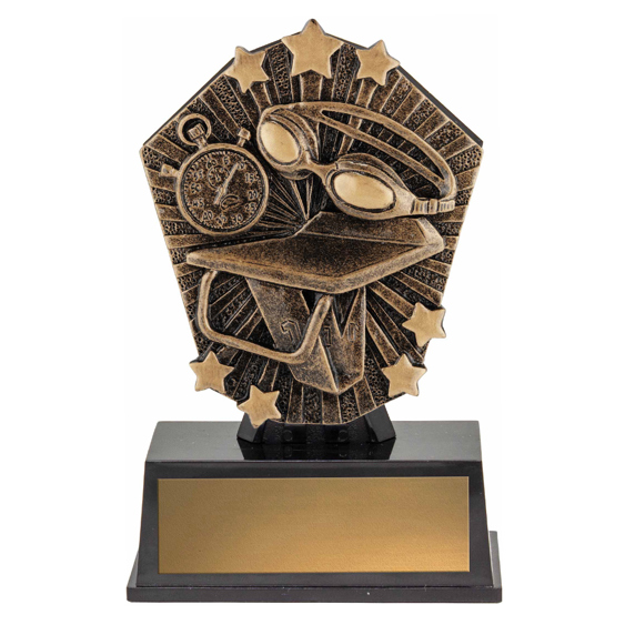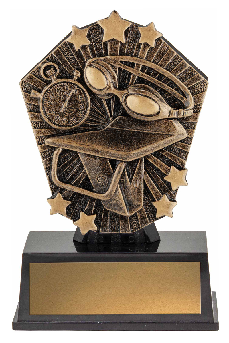 This compact swimming trophy captures the essence of competitive achievement with its gold and black design, star accents, and a stable base. Featuring a stopwatch, swimming goggles, and a diving board, it artfully celebrates the discipline and dedication of swimmers. An excellent addition to any collection of swimming trophies, this piece is both durable and visually striking.