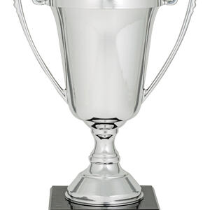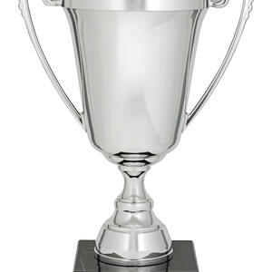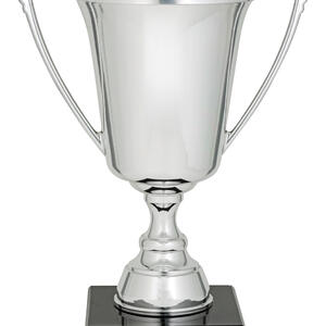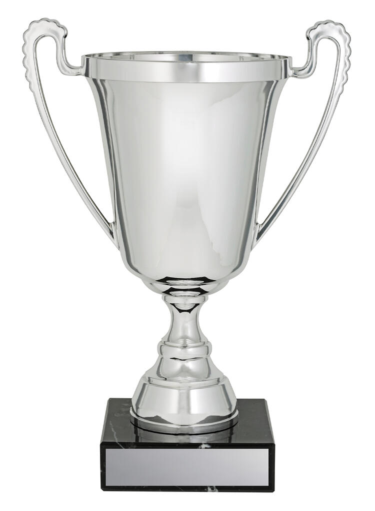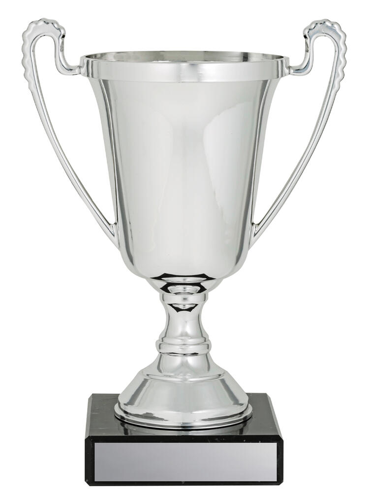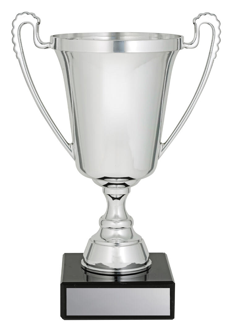 This silver plastic trophy cup features a classic silhouette with elegant handles and a gleaming, reflective finish. Crafted from durable plastic, it rests on a sturdy black marble base, offering a timeless look suitable for any general sports achievement. The understated plaque area is ready for customisation, making it a reliable and professional choice for memorable recognition.