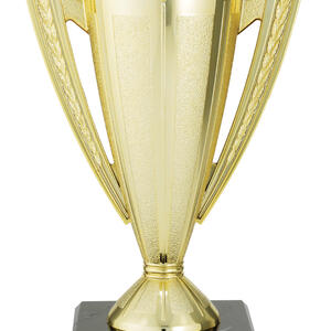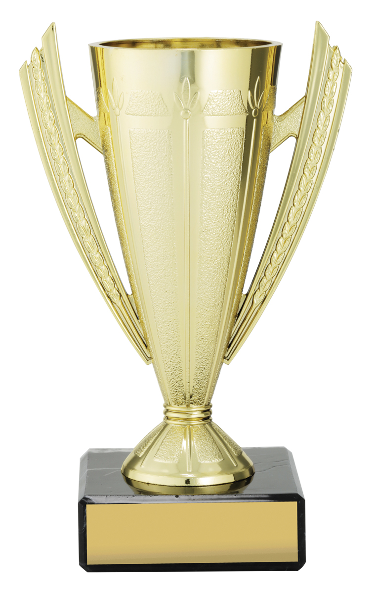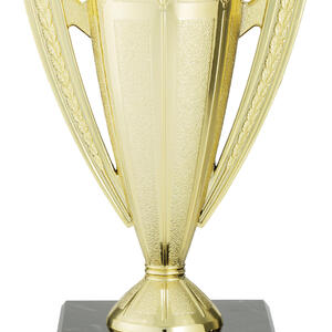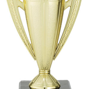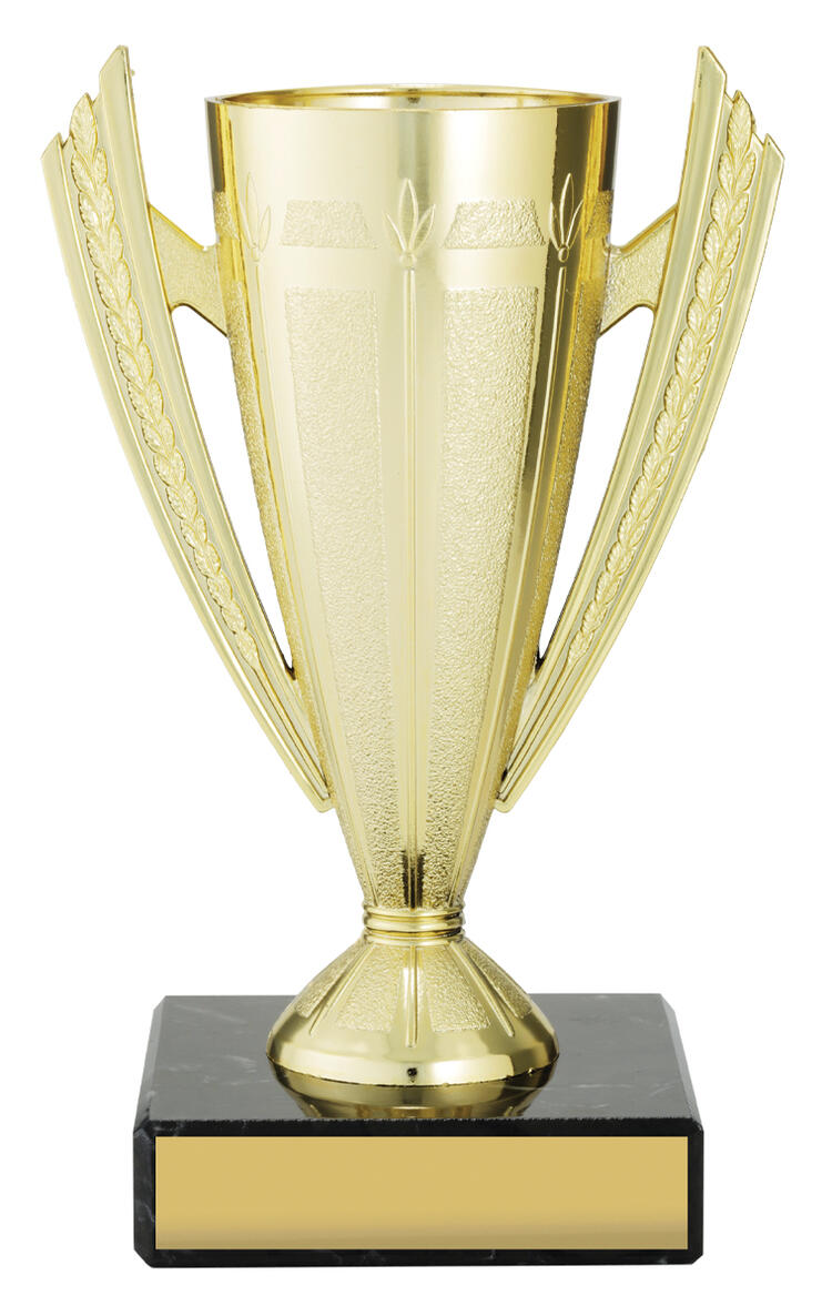 This plastic trophy cup offers a classic gold finish and timeless design for honouring achievement in any setting. Crafted with a durable plastic body, it features elegantly patterned handles and a sturdy black marble base. The textured surface and decorative details ensure a memorable and professional presentation for general sports or awards.