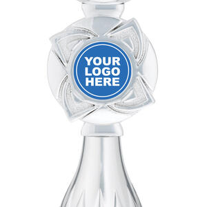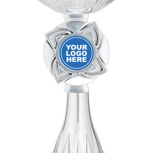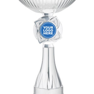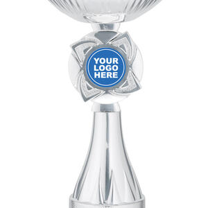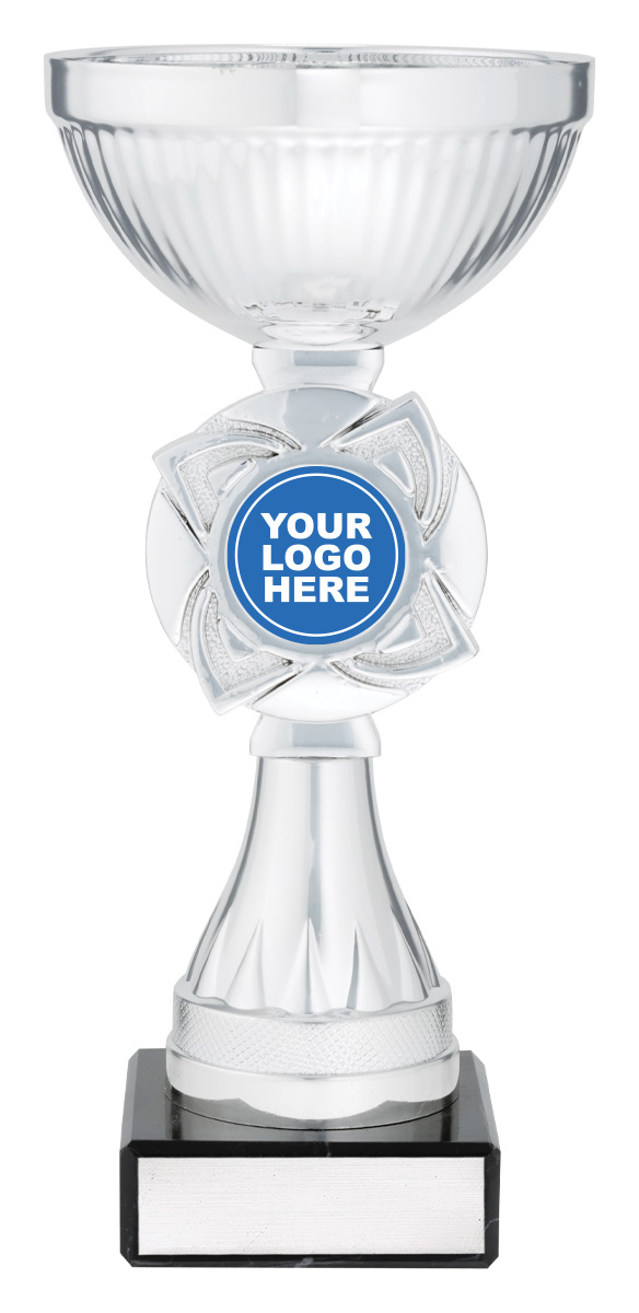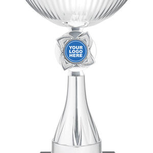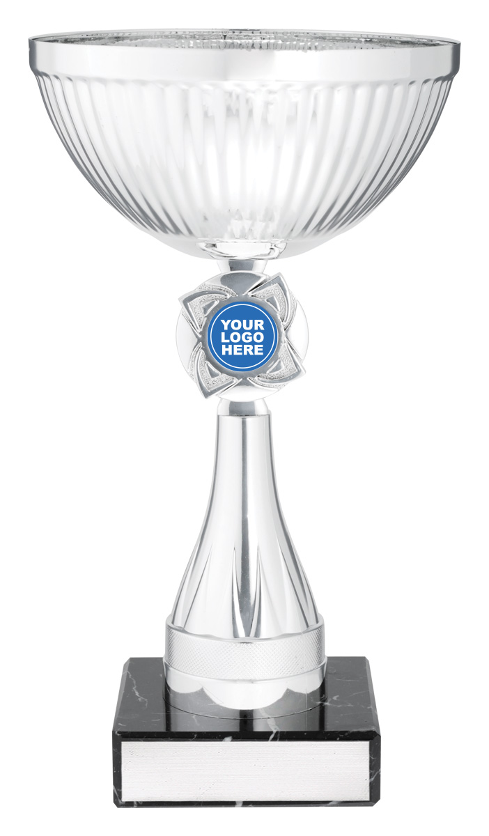 This silver rosette cup offers a timeless tribute to achievement, blending a lustrous round bowl with a sturdy square marble base. Crafted from high quality metal, plastic, and marble, it features a striking silver and black colour combination. The central 25mm emblem area provides opportunity for customisation, making it a versatile choice within the awards and trophies category.