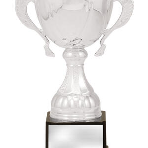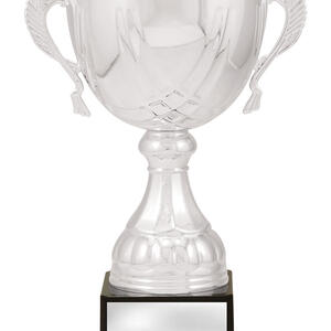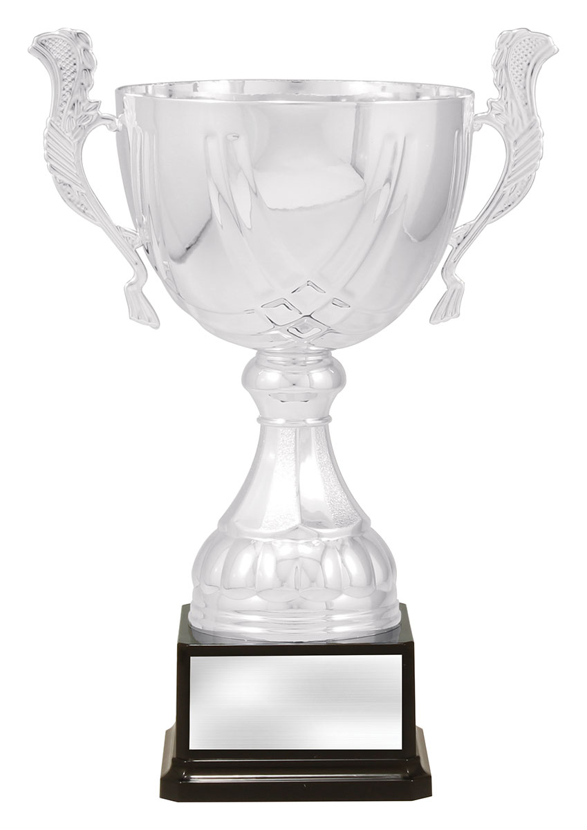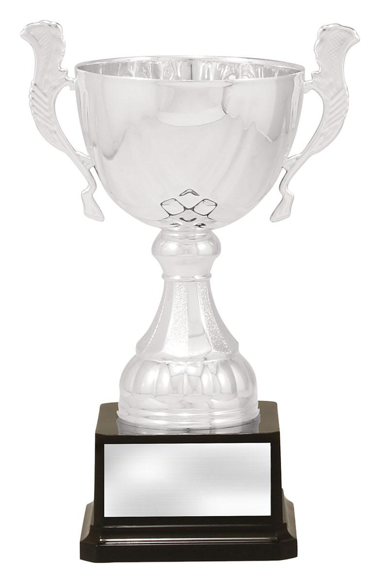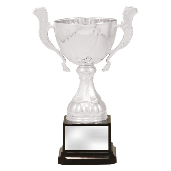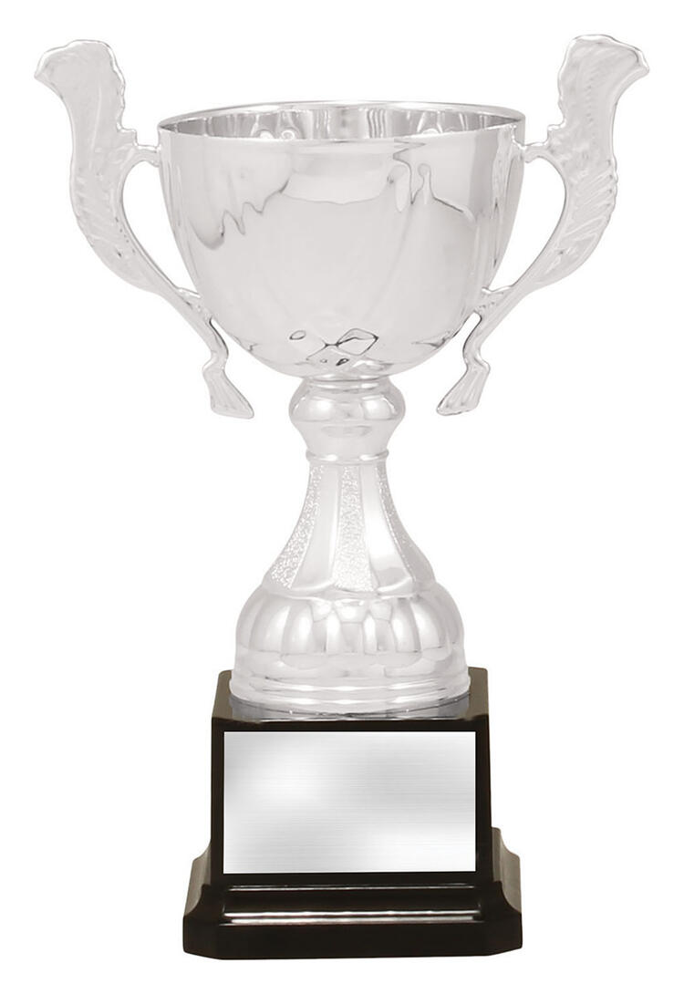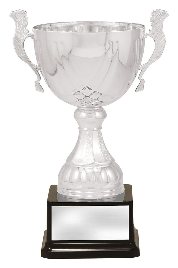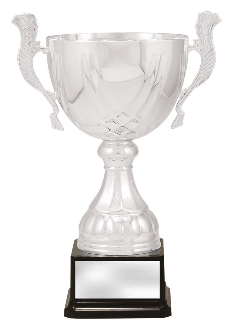 Crafted to honour achievement, this silver metal trophy cup features a timeless cup design with elegant handles and a brilliant reflective finish. The striking contrast of silver and black, paired with its sturdy metal and plastic construction, ensures a professional presentation. Mounted on a solid black base, it is an ideal choice for celebrating excellence in any sporting event.