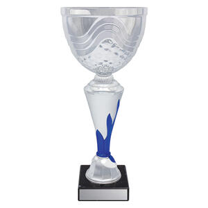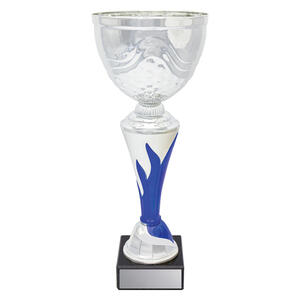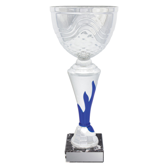 The Blue Flame Cup is a striking metal trophy cup, designed to honour achievement across any sport or event. Crafted from quality metal, plastic and marble, it features a bold silver, blue, and black palette. The wave pattern on the cup and flame like conical base create an elegant, contemporary silhouette, making it a memorable award for standout performances.