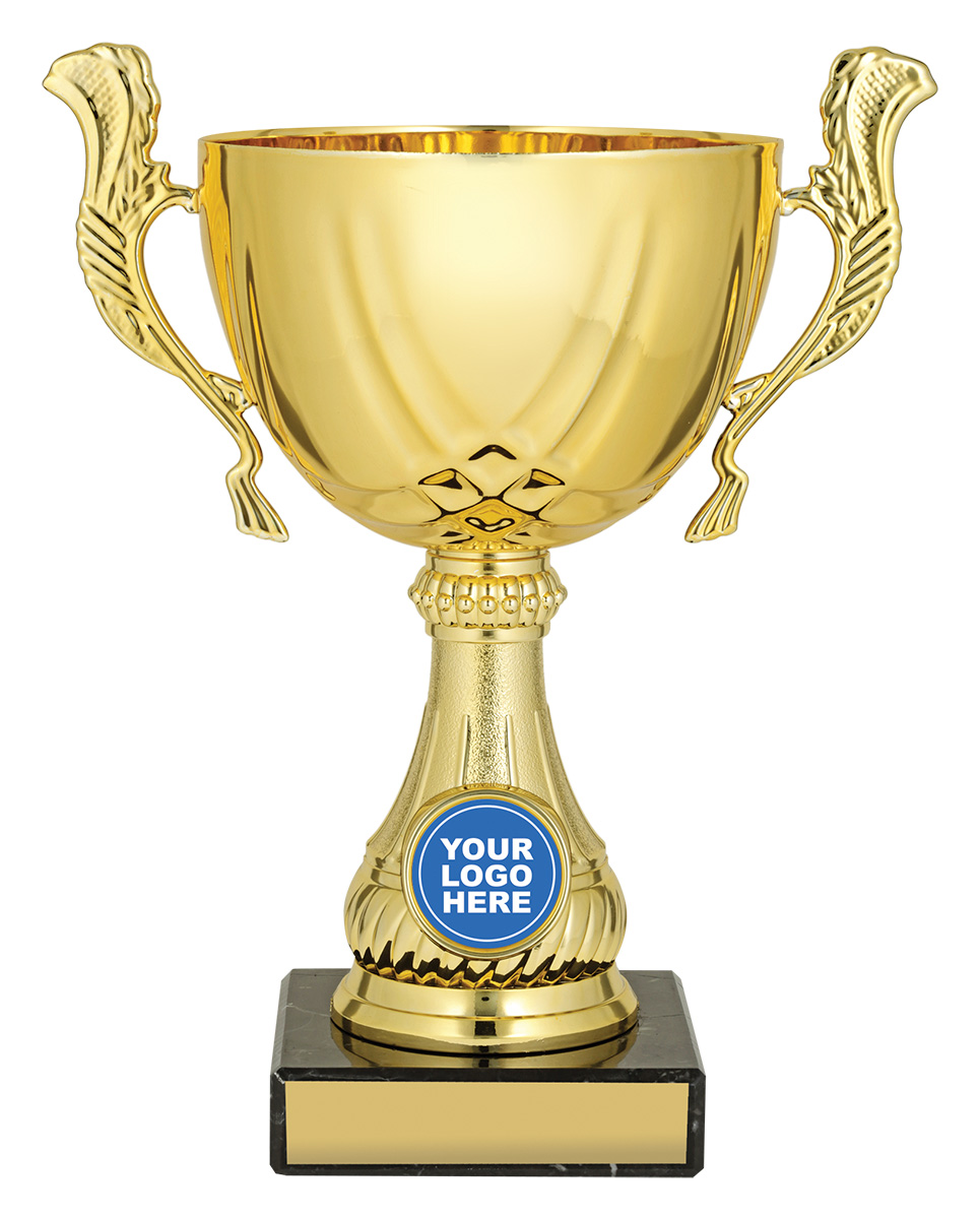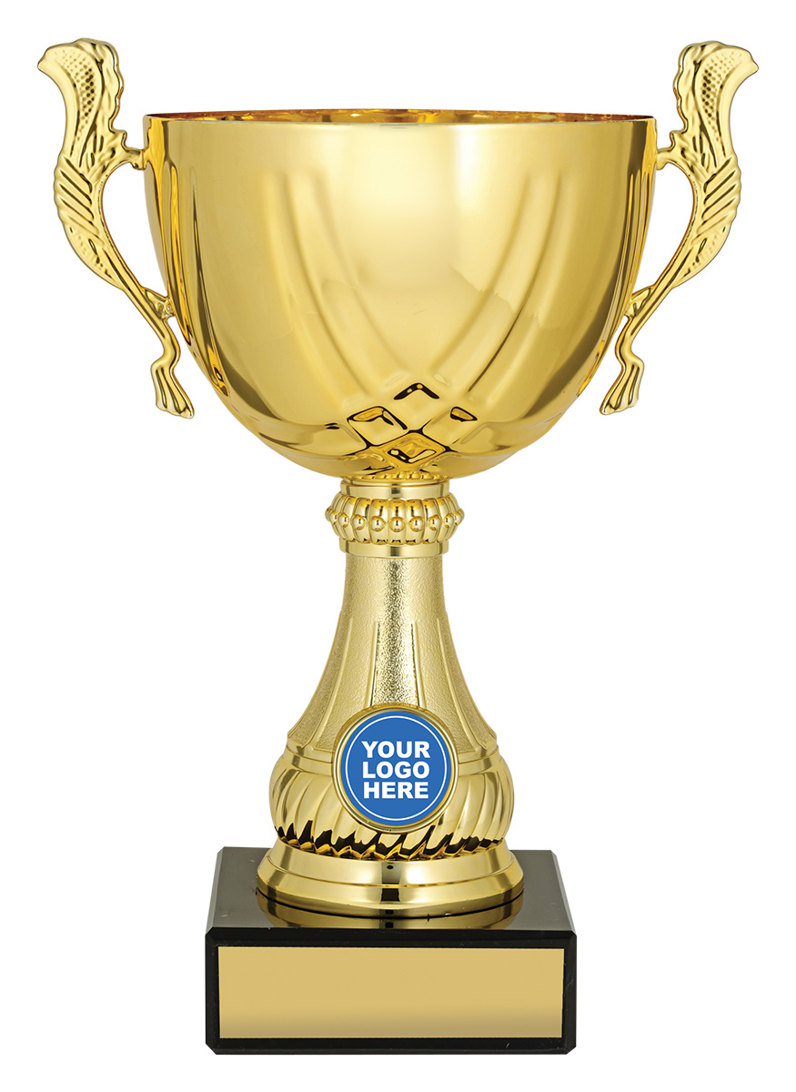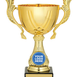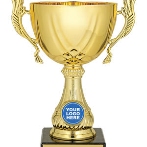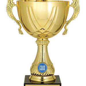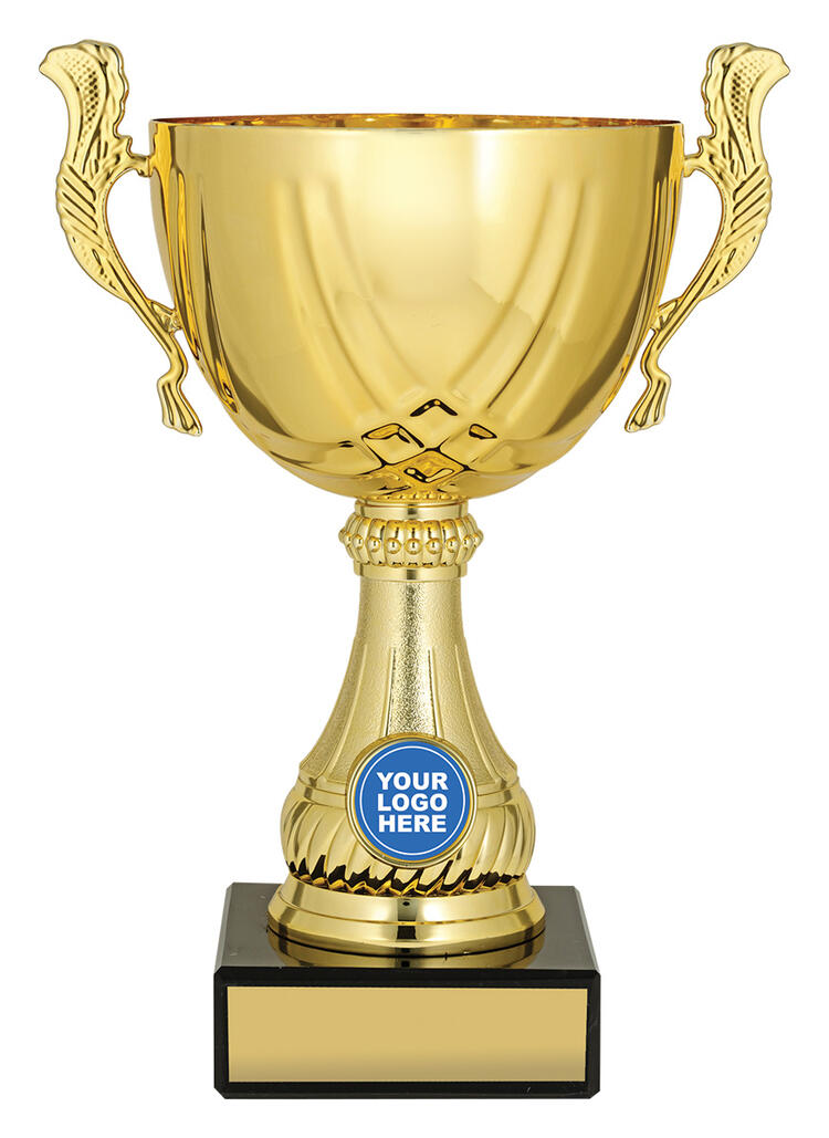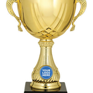 This gold trophy cup pairs a classic silhouette with refined gold and black accents, making it a fitting choice for any general sports achievement. Crafted from durable metal and plastic, it features elegant handles and a prominent customisable logo area. The sturdy base offers scope for engraving, allowing for truly memorable and professional recognition.