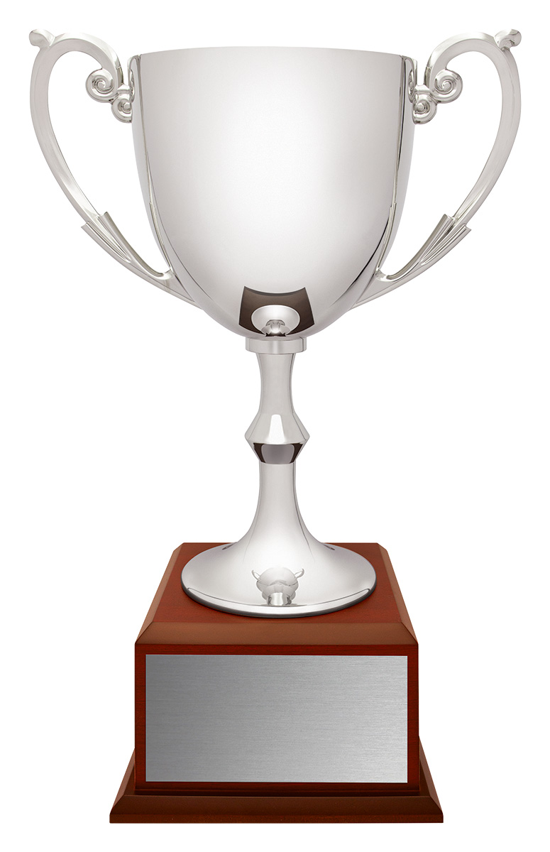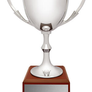 A distinguished metal trophy cup, this award features a lustrous silver finish adorned with classic handles. The elegant timber base provides a sturdy foundation, complemented by a metal plaque for custom recognition. Crafted for durability and timeless appeal, this cup is suited to honouring achievement across a broad spectrum of sporting and celebratory events.