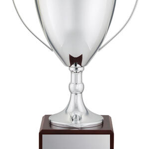 Showcasing refined craftsmanship, this silver trophy cup blends a lustrous metal cup and handles with a sophisticated brown wooden base. The polished metal surface and classic contours make it a fitting choice for recognising achievement in any sporting or organisational setting. Its substantial presence and timeless design ensure every award moment feels both memorable and exclusive.