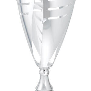 This silver trophy cup blends striking modern design with trusted durability. Crafted from lustrous metal and plastic, set on a solid black marble base, it features a flared top with refined cut out patterns that lend a distinctive edge. Its sleek form and elegant finish make it a memorable choice for celebrating excellence across any sport or achievement.