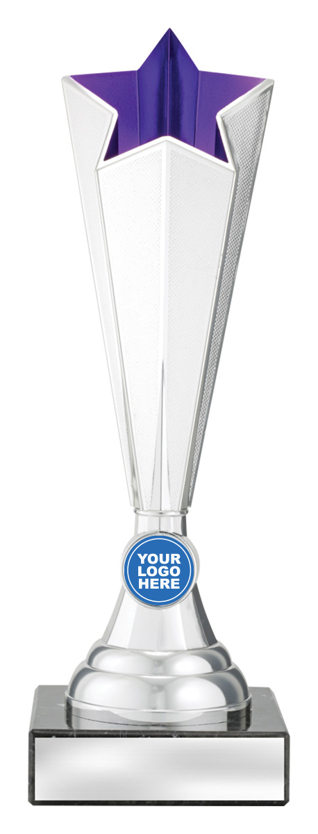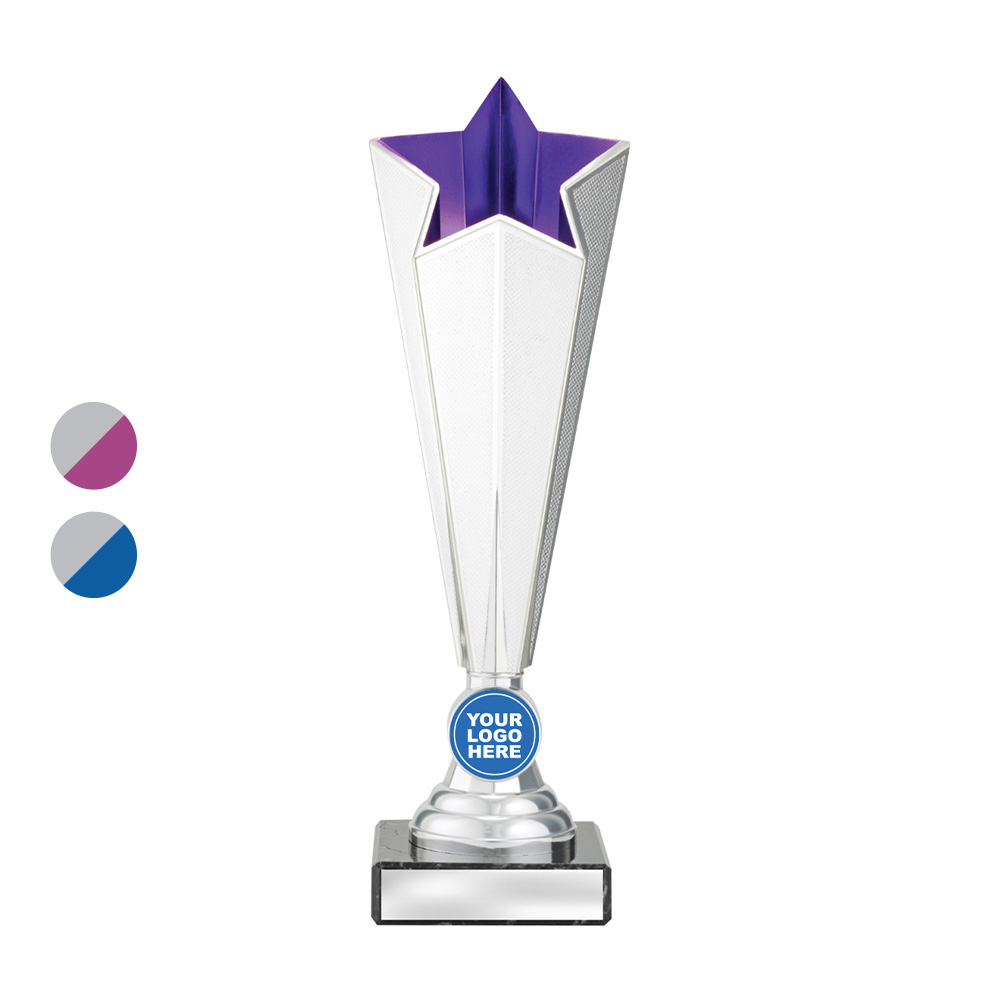 This budget star trophy stands out with its striking star shaped top and bold tapered body, finished in a blend of silver with vibrant purple or blue accents. Crafted from a combination of marble and plastic, it is both durable and elegantly designed for general recognition. The 25mm centre offers a customisable logo area, while the sturdy base is ready for further personalisation.