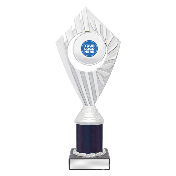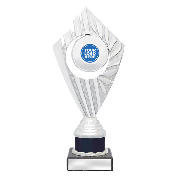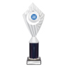 This elegant silver plastic trophy combines clean lines with a textured surface and laurel base design. Ideal for any sport or recognition event, it comes complete with a black marble base and engraving plate.