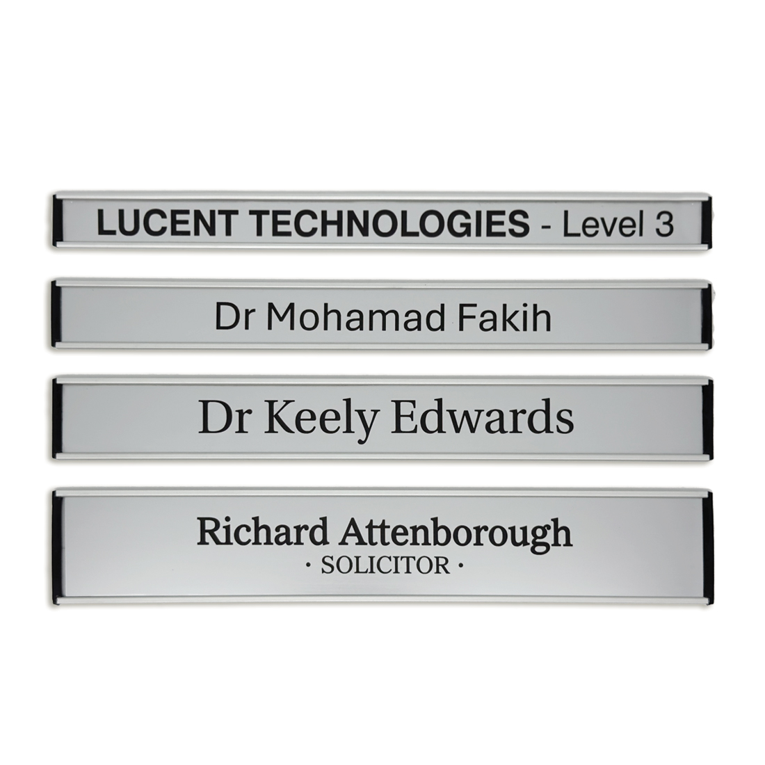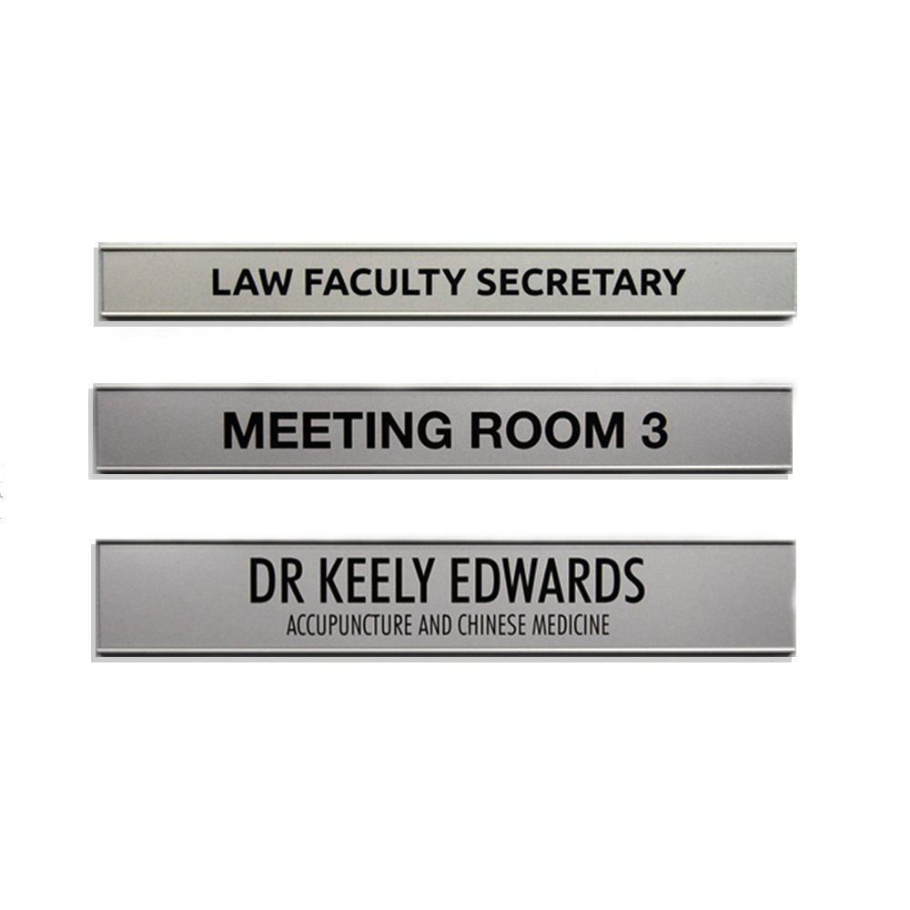 Our Alloy Extrusion Door Signs are a sleek and professional solution for office and workplace identification. Designed with a satin alloy frame, these signs feature slide-in plastic name plates that can be laser engraved or full-colour printed to suit your requirements. Available in four different heights, each sign is 300mm wide and can be fully customised with names, titles, or logos.