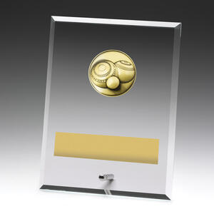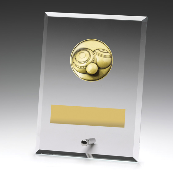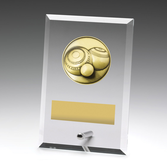 Clear crystal lawn bowls plaque with bevelled edges and gold emblem. This modern freestanding design is a stylish way to recognise performance and dedication in bowls.