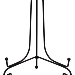 This metal black easel holder features a sleek, triangular silhouette with a gracefully curved base and decorative curled ends. Crafted from durable metal, it serves as a reliable and elegant stand for plates in any professional or celebratory setting. The classic black finish adds a touch of sophistication, making it ideal for both display and presentation purposes.