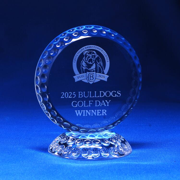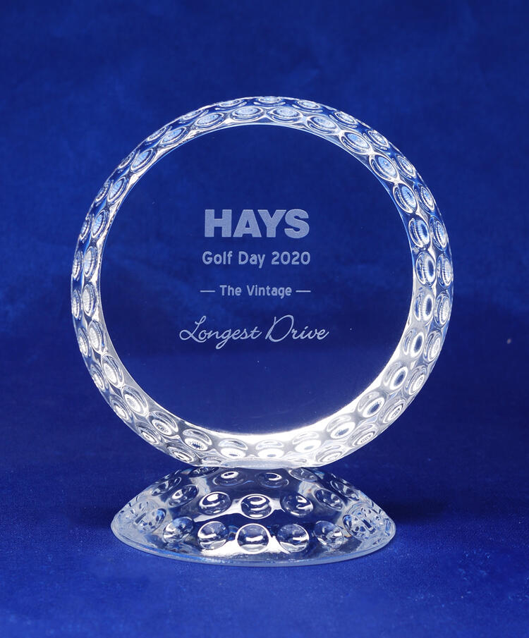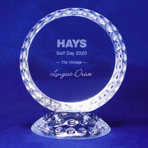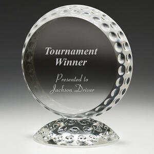 A distinctive crystal golf award with dimpled texture replicating a golf ball, complete with matching crystal base. This elegant piece makes a standout trophy for tournaments, club events or corporate golf presentations.