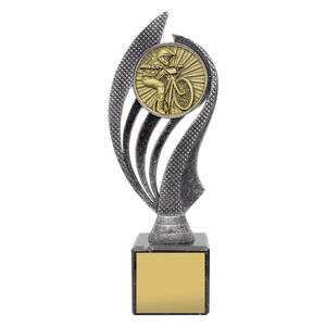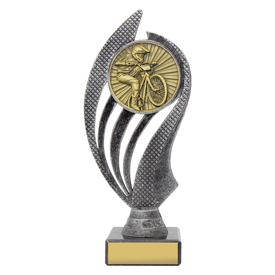 Silver resin BMX trophy with a dynamic wave design and gold rider emblem. Mounted on a solid base, this sleek award symbolises movement and performance. Perfect for recognising top BMX achievements.