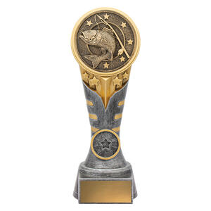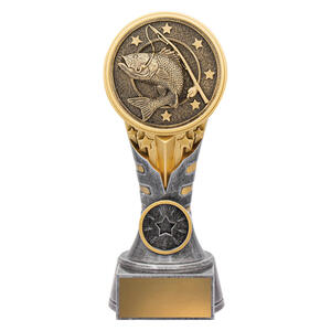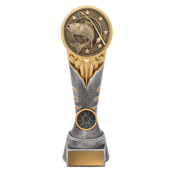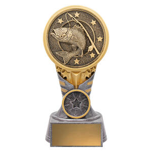Crafted from resin, this stylish fishing trophy features a circular fish and rod emblem mounted on a solid base. A versatile design perfect for recognising performance in fishing tournaments or club events.