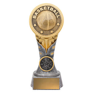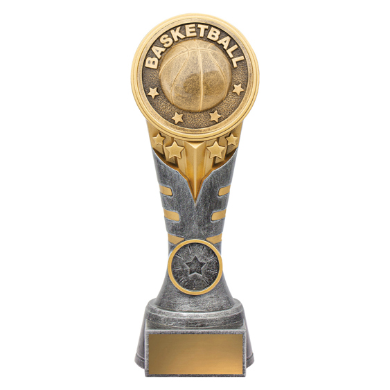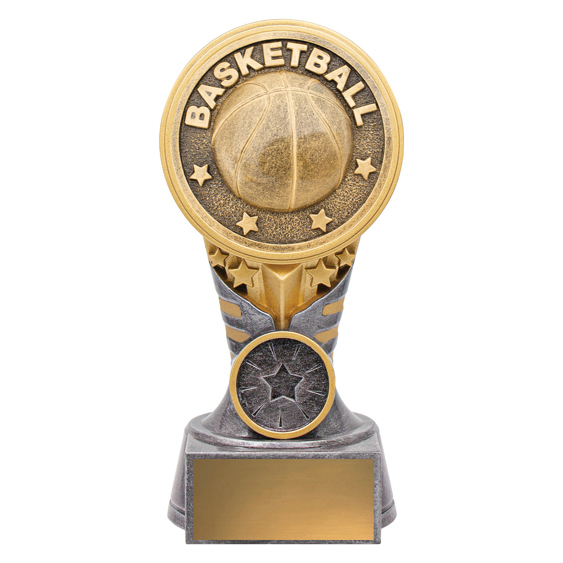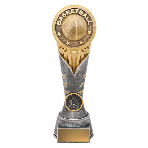 This bold silver and gold basketball trophy features a circular medallion design, surrounded by raised stars and laurels. A contemporary take on a traditional shape, itÂ’s perfect for rewarding excellence across all levels of basketball. Includes gold engraving plate.