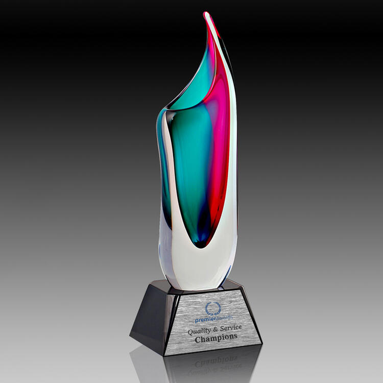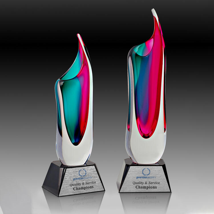 Striking in rose and green hues, this art glass trophy features an elongated, abstract form with a gracefully curved top. Handblown by skilled artisans, each piece displays subtle variations, making every award truly unique. Set on a sleek black base it is a refined choice for corporate awards or special recognition occasions.