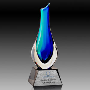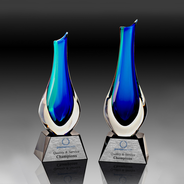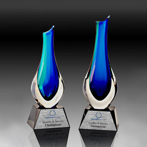 This art glass trophy presents a harmonious blend of blue, green, and clear glass, shaped in an elongated vase with a graceful curved top. Designed for all types of recognition, it sits on a sleek black base, offering a refined and contemporary look.