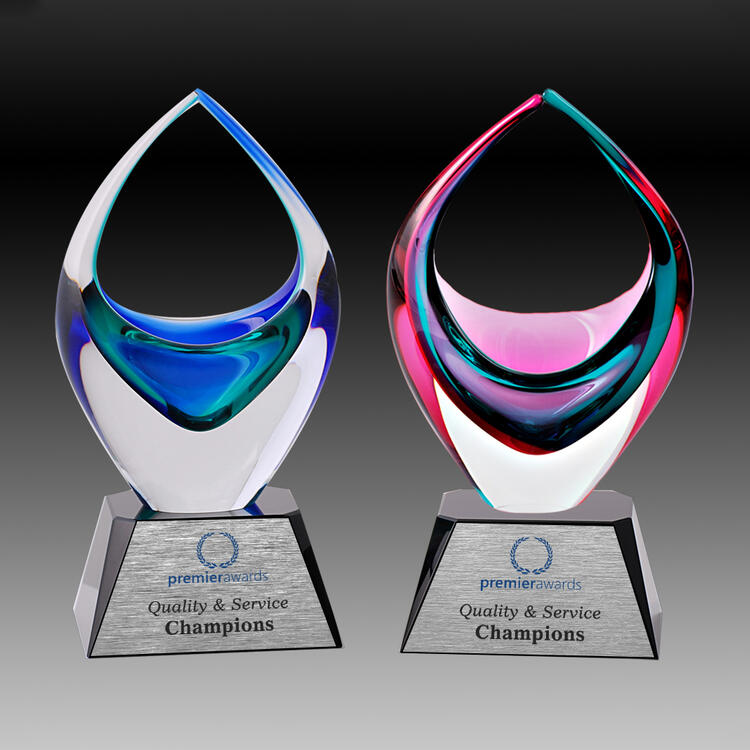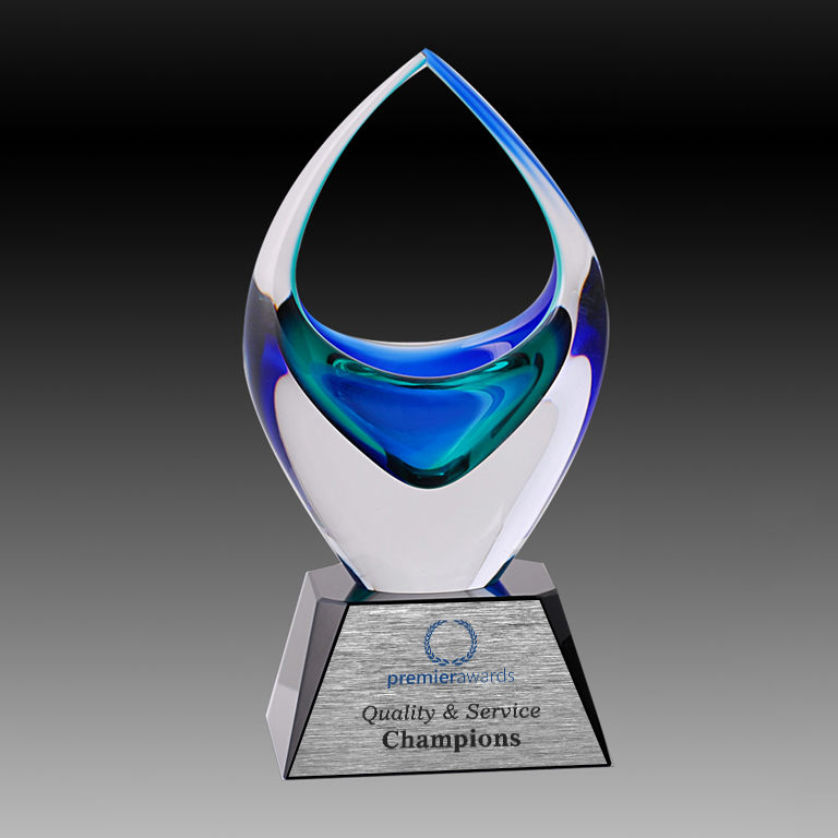 This art glass trophy features a striking teardrop shape with vibrant blue and green accents swirling through clear glass. Expertly crafted and individually handmade, each piece offers subtle variations that underscore its exclusive character.
