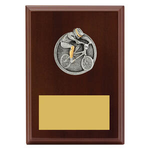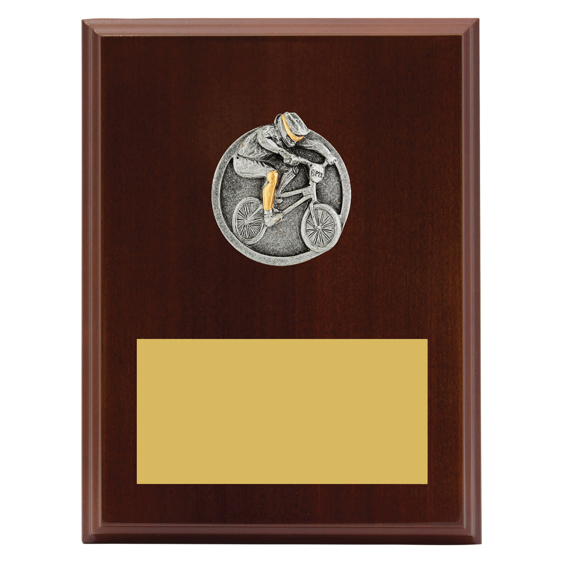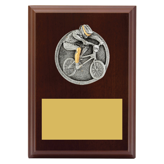 A timber BMX plaque featuring a silver and gold rider emblem and gold engraving plate. A traditional design that offers a professional presentation for BMX club awards and recognition.