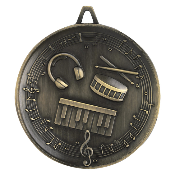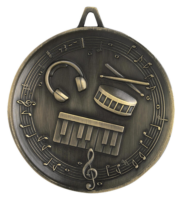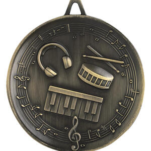 Crafted in durable metal with an elegant circular shape, this heavyweight music medal celebrates musical talent with a refined finish. Embossed details featuring a treble clef, drum, keyboard, and headphones create a standout look, making it an ideal choice for music award medals at school performances, competitions, or community events.