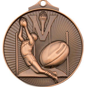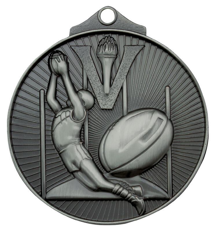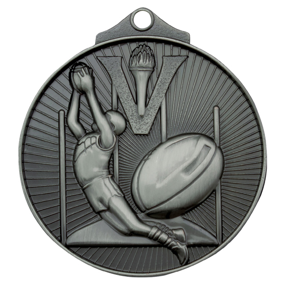 Celebrate sporting achievement with these distinguished aussie rules medals, expertly crafted in solid metal and offered in antique gold, silver, and bronze finishes. The circular 52mm design features a bold 3D depiction of a player catching a ball, goal posts, and a prominent 'V' with a torch, framed by an extra thick edge for added durability.