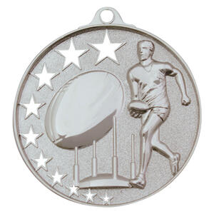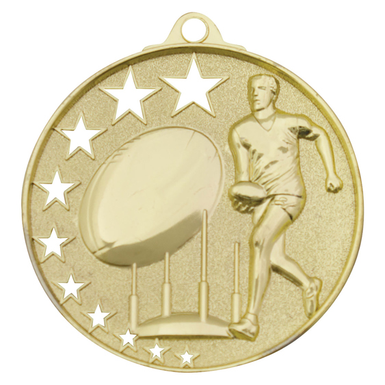Celebrate achievement on the field with this aussie rules football medal, expertly crafted in a durable 52mm circular metal design. Available in gold, silver, and bronze finishes, it showcases a dynamic player with ball, goalposts, and star themed detailing in the centre. A distinctive star border adds a memorable and professional touch, perfect for recognising excellence in Aussie Rules Football.